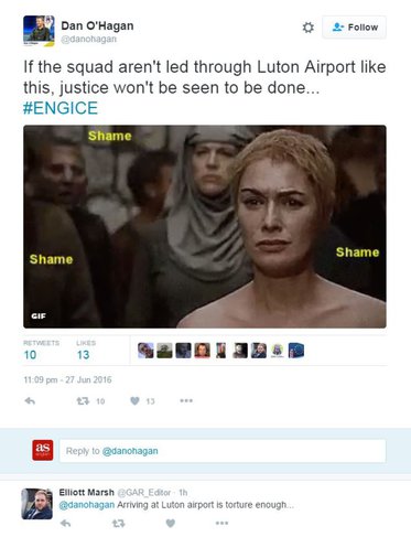 Пользователи интернета вспомнили «позорное шествие» Серсеи Ланнистер («Если команда не пройдет такой же путь через аэропорт «Лутон», справедливость не будет восстановлена»)…