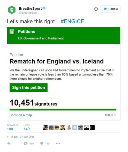 Английские любители футбола даже спародировали петицию за повторный референдум. В их варианте петиция призывает голосовать за переигровку.