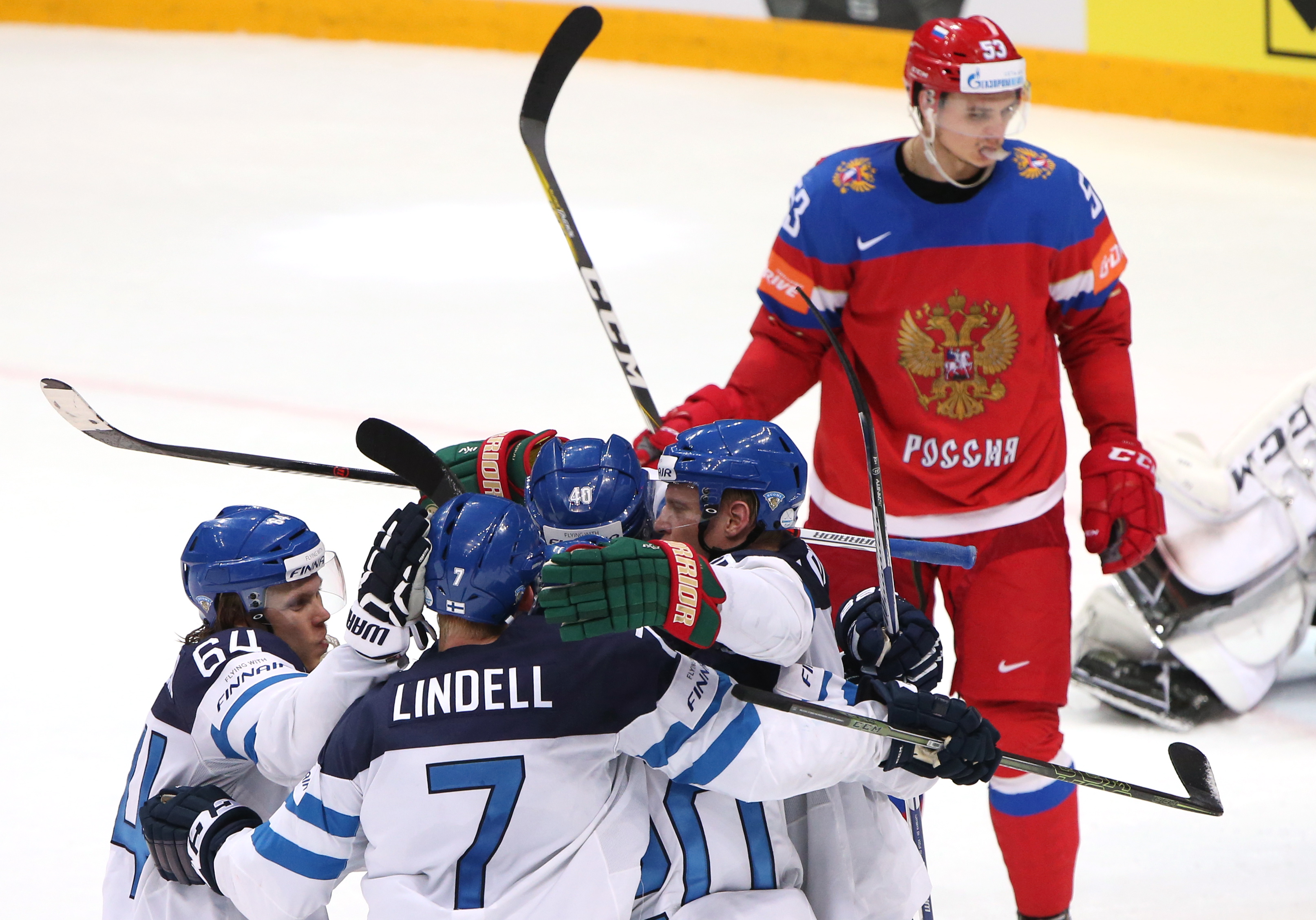 Первый финалист определялся в европейской паре, где непобедимые финны играли против хозяйки турнира — России. Дополнительный интерес к этой встрече подогревался обидными поражениями сборной России в играх с Финляндией (ОИ-2006, ОИ-2014, ЧМ-2007, ЧМ-2011). Пожалуй, именно эти четыре неудачи являются самыми памятными и болезненными для болельщиков и хоккеистов сборной России.