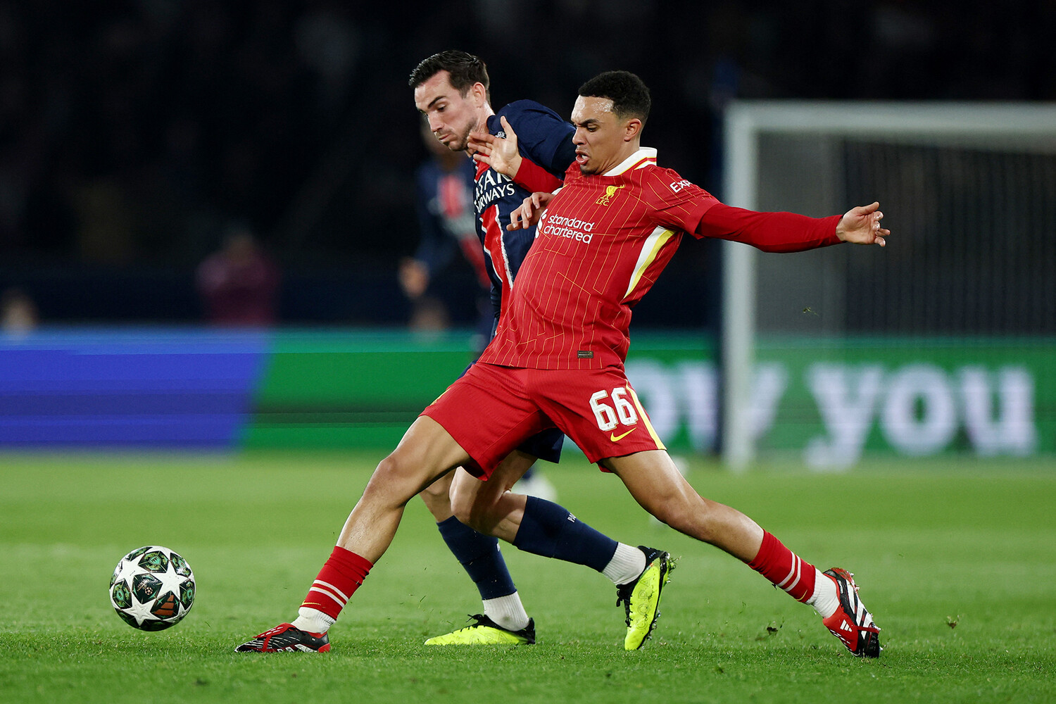 Первая атака «ПСЖ». Кварацхелия разогнал и недалеко от штрафной «Ливерпуля» сыграл направо, но Хакими в борьбе с Диасом упал и упустил мяч за лицевую.