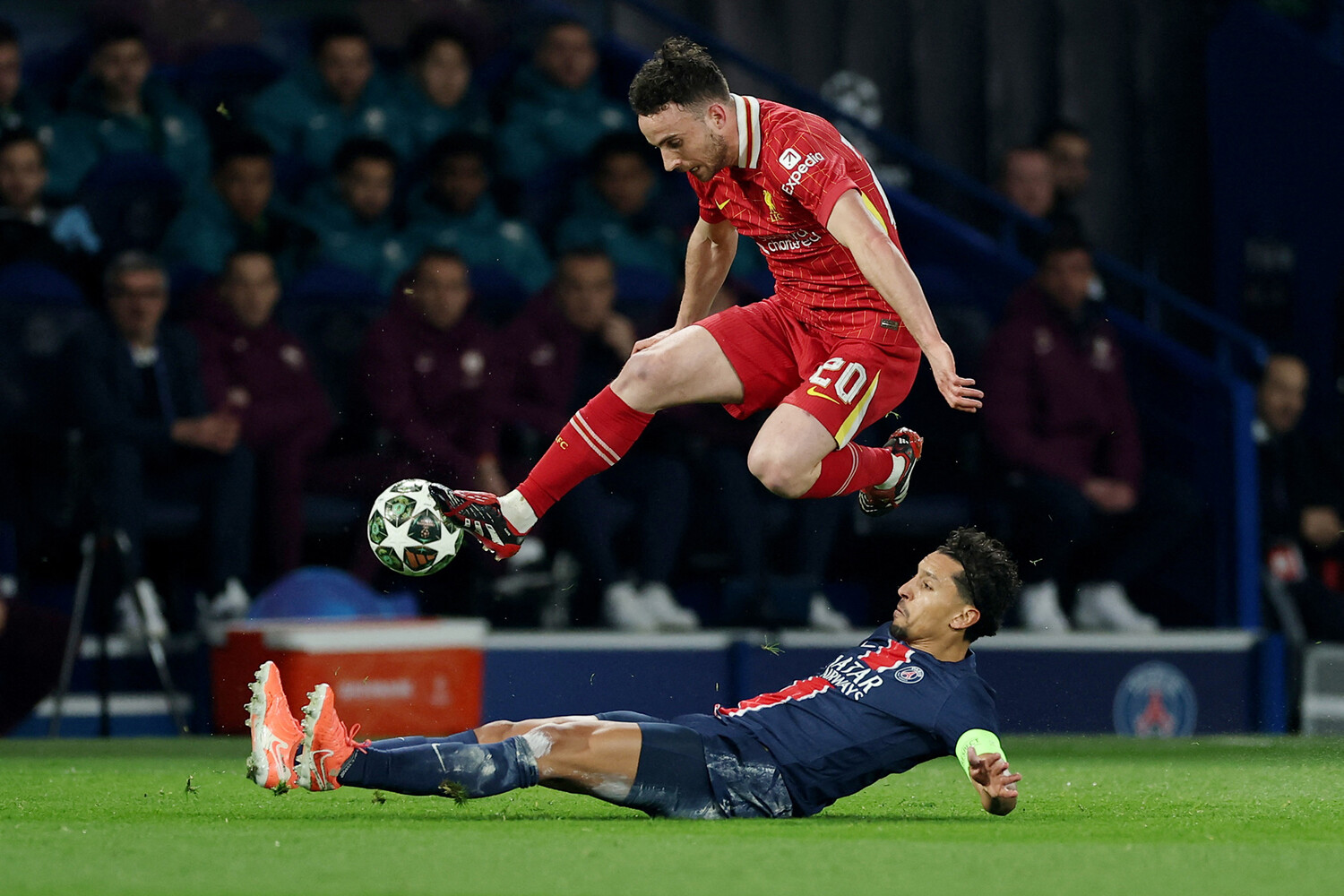 Жота пошел слева в штрафной «ПСЖ» в дриблинг, но Маркиньос образцово справился.