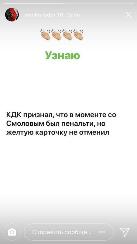Футболист в инстаграме опубликовал текст: «КДК признал, что на моменте со Смоловым был пенальти, но желтую карточку не отменил».