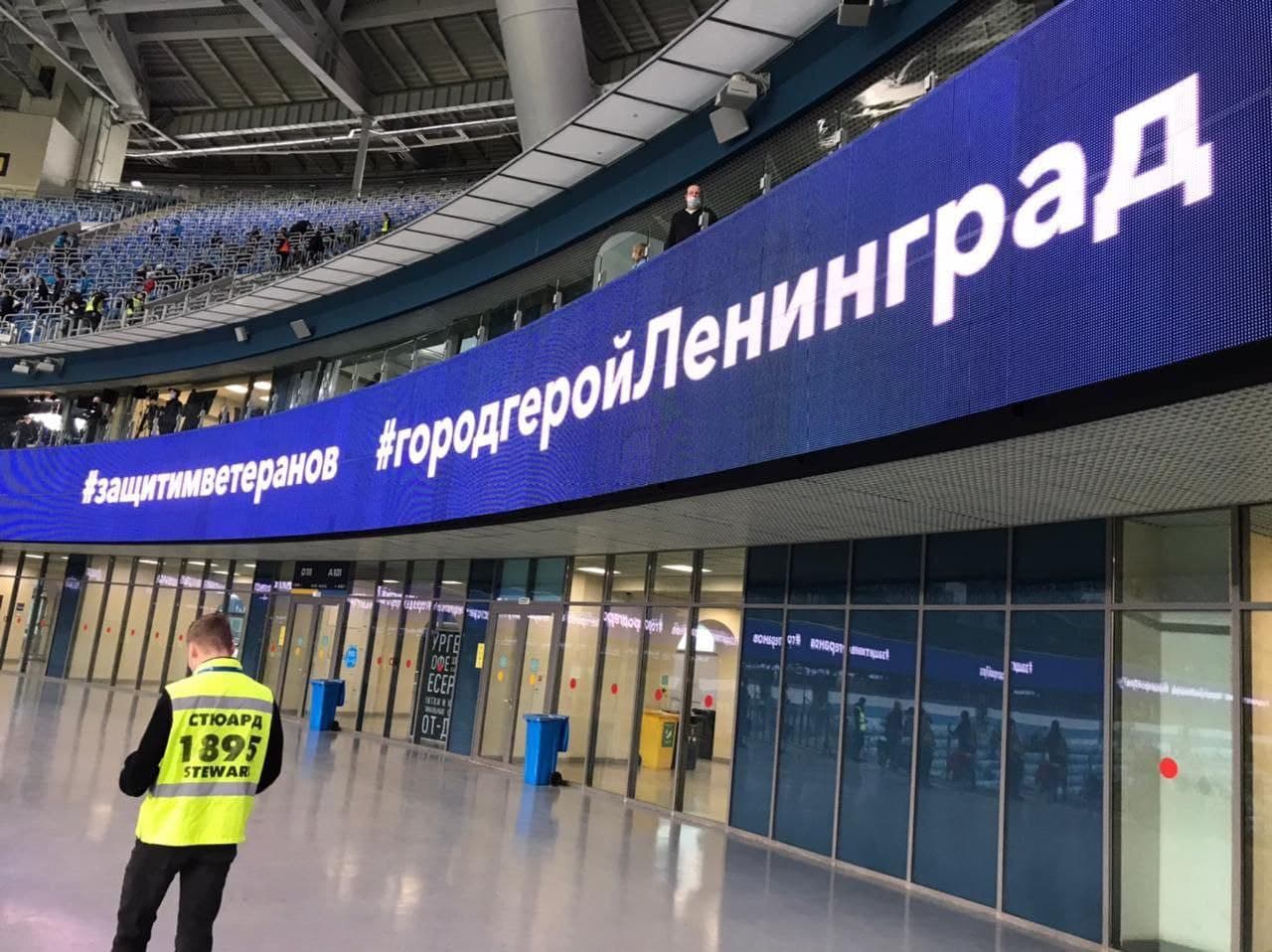 На информационном табло над секторами высветились надписи #защитимветеранов, #городгеройленинград, #городгеройТула.