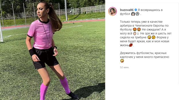 «Я возвращаюсь в футбол. Только теперь уже в качестве арбитра на чемпионате Европы. Не ожидали? А я могу все. Не зря же я шесть лет сидела на трибуне. Форма у меня будет яркая, как и моя новая жизнь. Держитесь, футболисты, красных карточек у меня много припасено», — написала Бузова в Instagram.