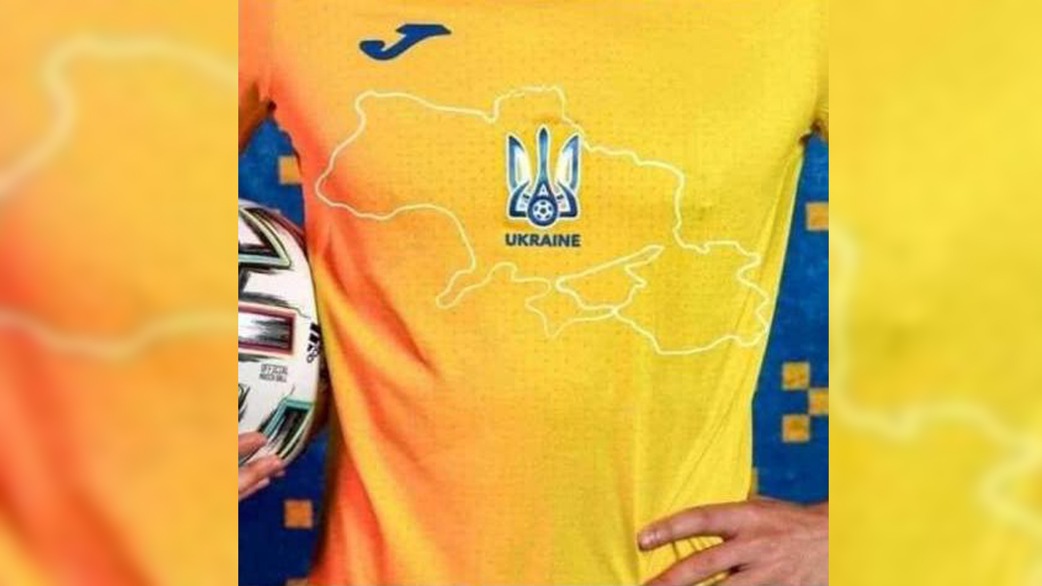 6 июня прошла презентация новой экипировки украинской сборной. Главной особенностью формы стало обозначение границ Украины, в которые также входит Крым. На воротнике футболки присутствует лозунг «Слава Украине! Героям слава!». Сначала Союз европейских футбольных ассоциаций (УЕФА) одобрил форму национальной команды, однако после запроса Российского футбольного союза (РФС) организация потребовала убрать с внутренней части воротника «Героям слава!», так как в сочетании с первой частью слоган является «явно политическим по своей природе».