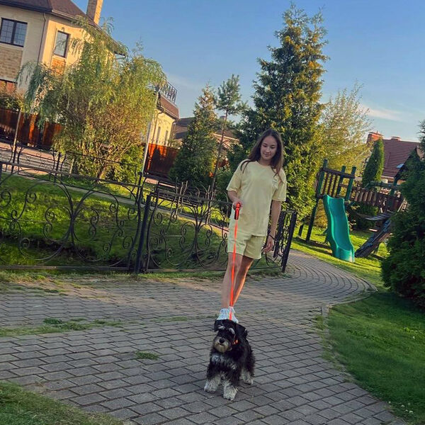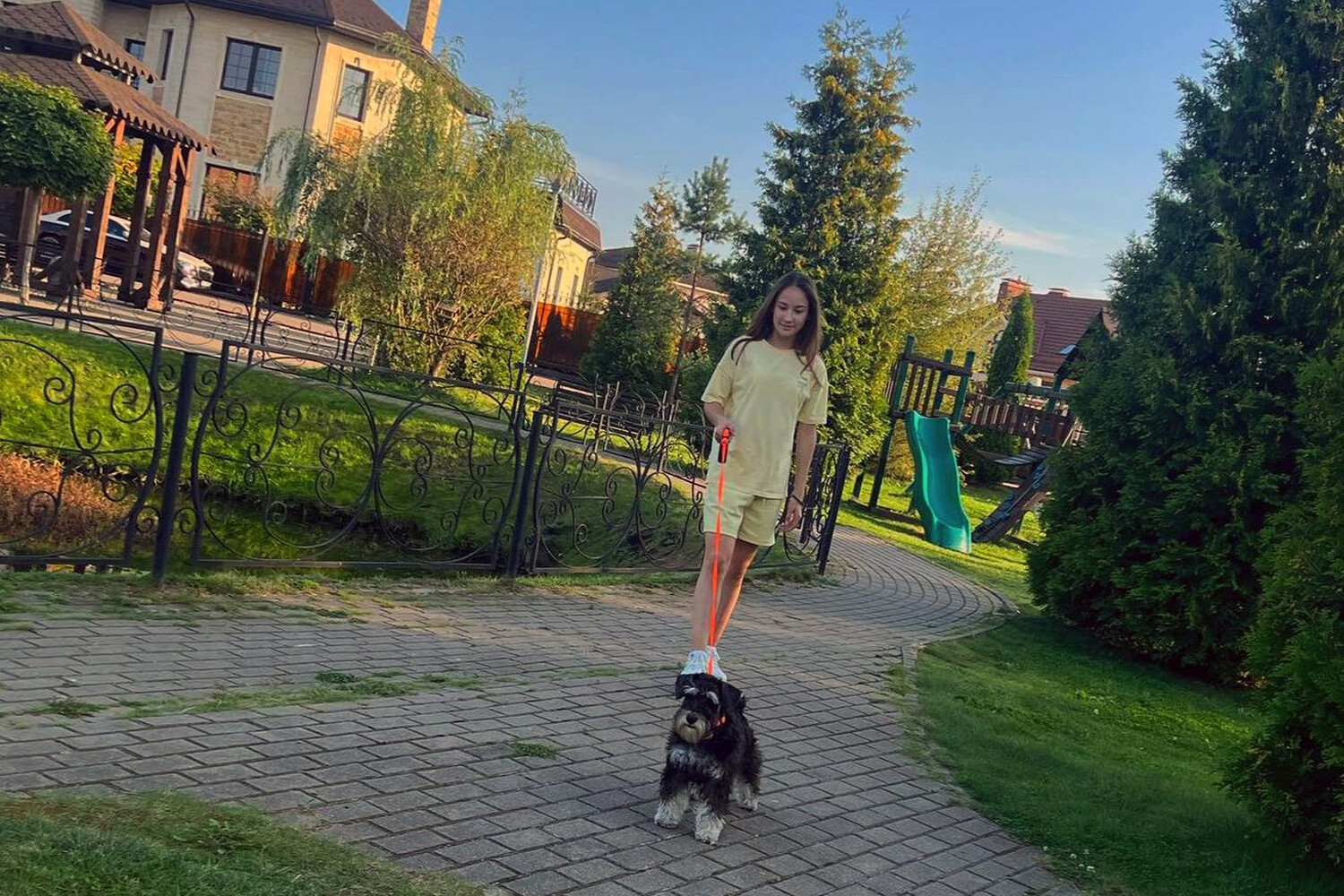 На одном из снимков, она позирует в целеных шортах и футболке, держа на поводке собаку.