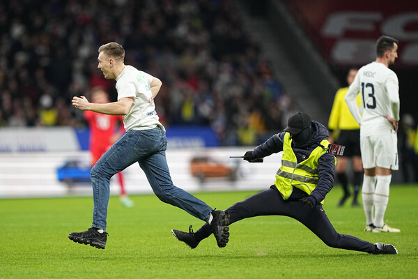 Фанат выбежал на поле во время матча России и Сербии
