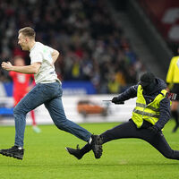 Инцидент случился на 69-й минуте. Несколько стюардов пытались догнать фаната, однако в итоге мужчина сам подошел к сотрудникам, которые отвечали за безопасность, и сдался.