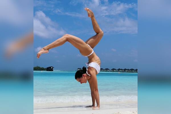 На снимке девушка позирует в купальнике, выполняя стойку на руках