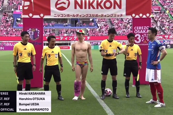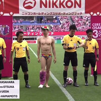 Перед матчем чемпионата Японии по футболу между командами «Иокогама Ф. Маринос» и «Сересо» на поле вышел мужчина, на котором были только трусы и бейсболка. Об этом передает «Чемпионат».