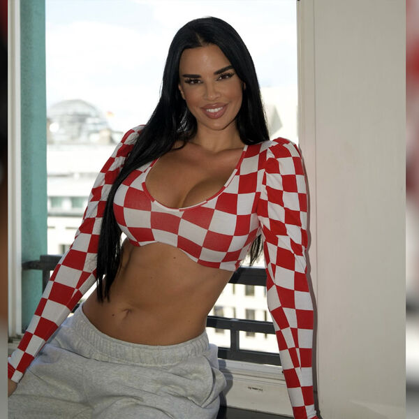 На снимке модель позирует в топе, который повторяет расцветку формы сборной Хорватии.