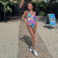 На кадрах спортсменка позирует, стоя в разноцветном купальнике.