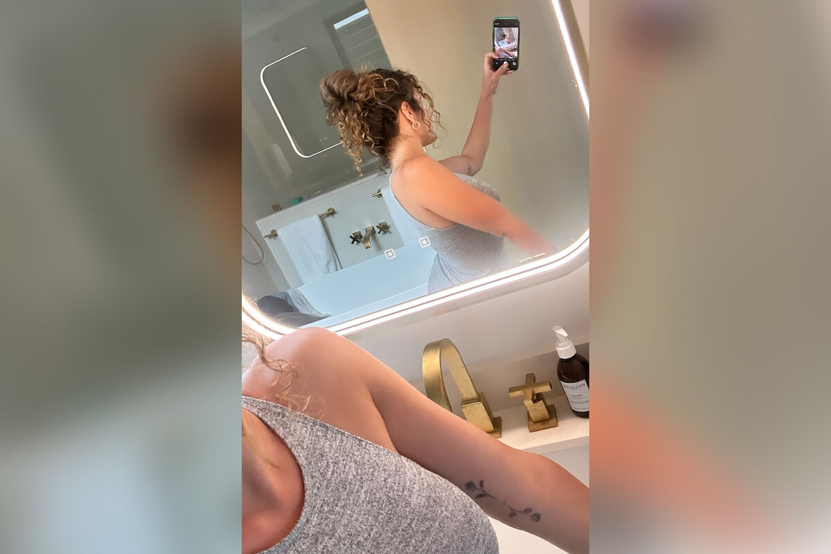 На снимке она позирует в сером топе, сфокусировавшись на левой груди.