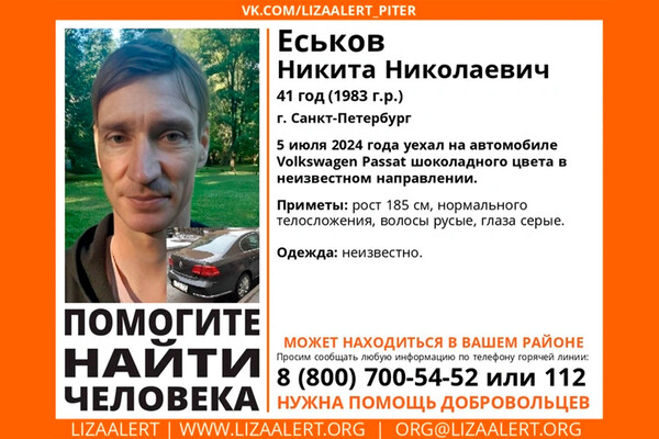 В ориентировке, опубликованной на сайте добровольческого поисково-спасательного отряда «ЛизаАлерт», указано, что Еськов уехал на автомобиле 5 июля 2024 года в неизвестном направлении.