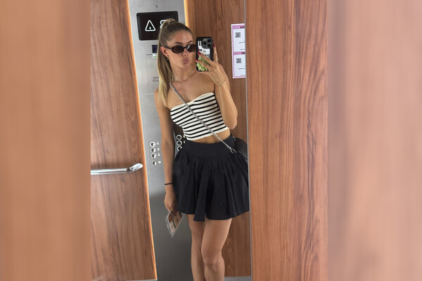 Спортсменка позирует на снимке в черной мини-юбке.