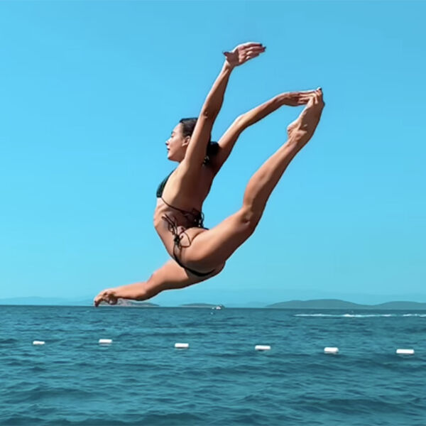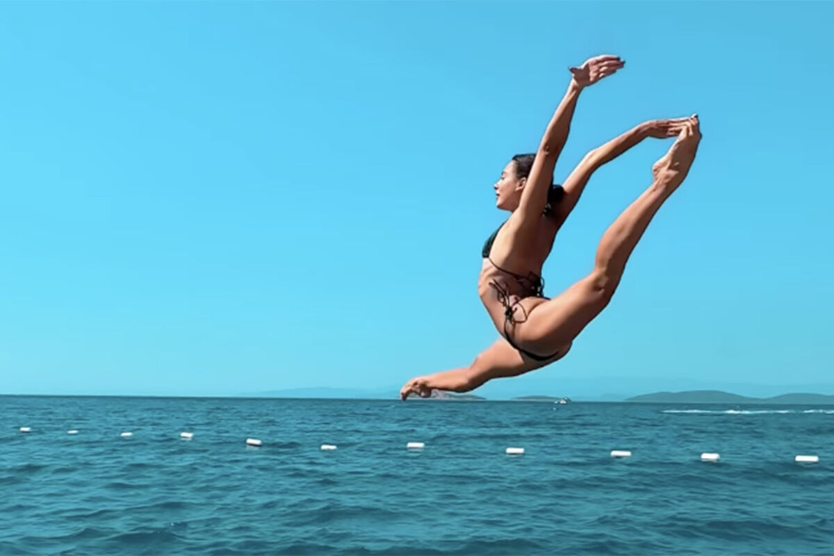 Гимнастка выложила фото прыжка в море с платформы — спортсменка вошла в воду руками вперед, после чего выплыла на поверхность.
