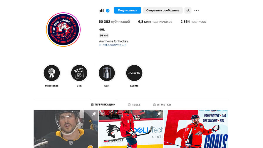 Национальная хоккейная лига (НХЛ) изменила аватарки в своих социальных сетях, посвятив их погоне российского нападающего «Вашингтон Кэпиталз» Александра Овечкина за рекордом канадца Уэйна Гретцки.