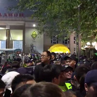 Стюарды просят болельщиков пользоваться другими входами на стадион. Полиция пока не вмешивается в происходящее.