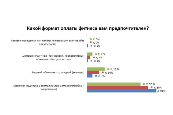 «Поколение Y (25-40 лет) также настроены на покупку месячного абонемента в 80% случаев, однако за год готовы заплатить в два раза больше по сравнению с предыдущим поколением — почти 16%.