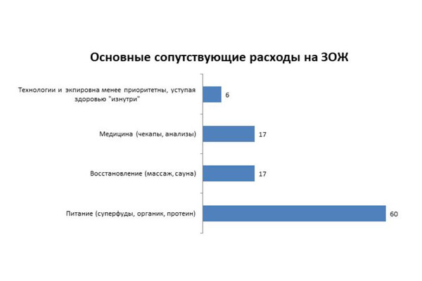 60% любителей спорта выбирают дополнительно оплатить специальное питание (суперфуд, органик, протеин), 17% — массаж и сауну, 17% — медицину (чекапы), 6% — технологии и экипировку.