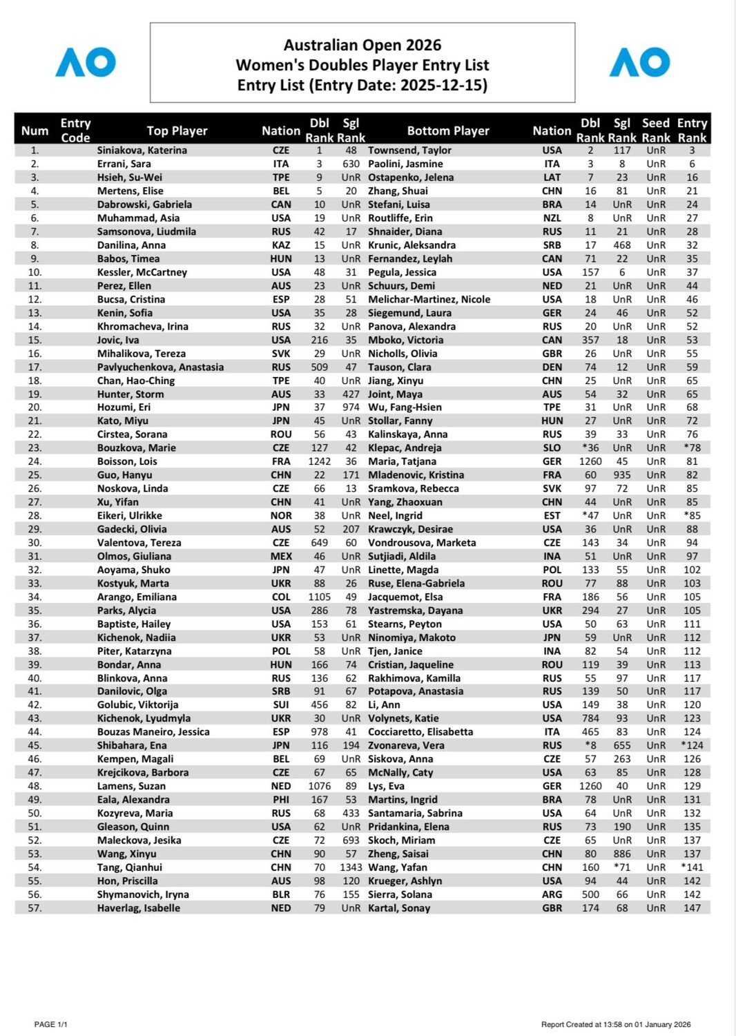 Пресс-служба Открытого чемпионата Австралии (Australian Open — 2026) на своем официальном сайте обозначила гражданство у российских теннисисток, которые будут выступать на турнире в парном разряде.