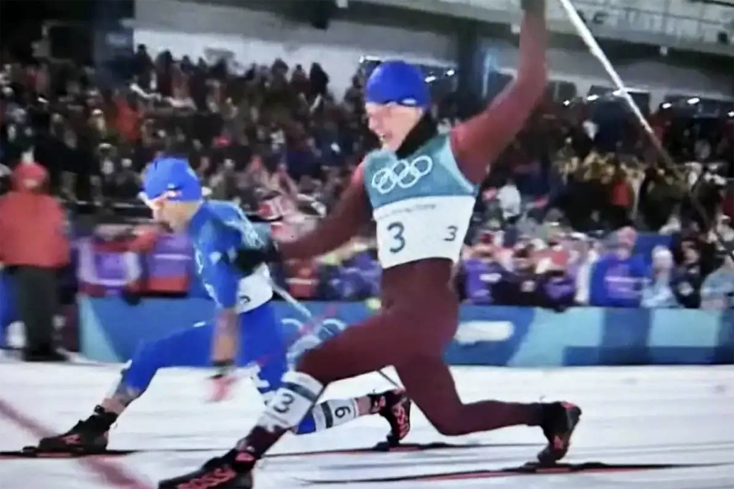 В видеоролике МОК показан фрагмент финиша Большунова в спринте классическим стилем на Олимпийских играх в Пхенчхане. Тогда российский спортсмен выиграл бронзовую награду.