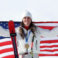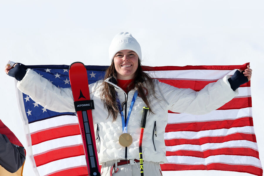 Джонсон завоевала золото в скоростном спуске. Во время празднования победны на награждении от медали оторвалась лента.