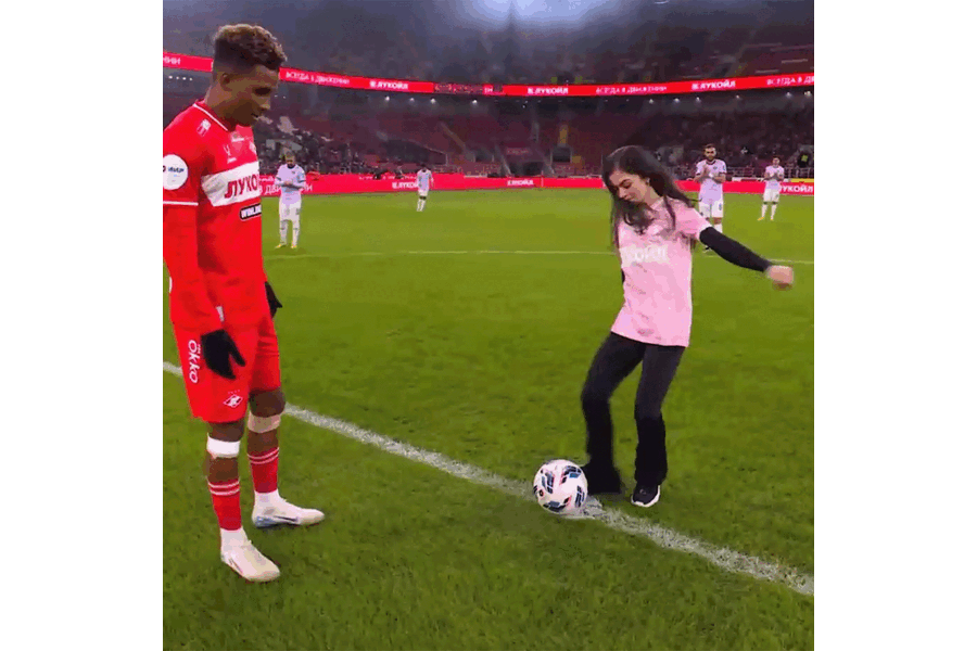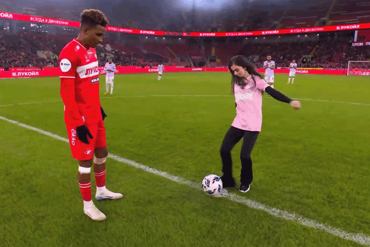 Российская фигуристка Аделия Петросян нанесла символический удар по мячу перед матчем 20-го тура Мир Российской премьер-лиги (РПЛ) между московским «Спартаком» и тольяттинским «Акроном».