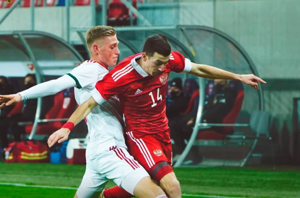 Игнатьев пробил головой после подачи с углового — мяч угодил в стену из многочисленных защитников сборной Венгрии.