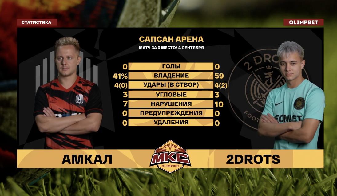 Финальный свисток! 2DROTS просто раскатали «Амкал» и завоевали бронзовые медали МКС! Да, счет всего лишь 1:0 (Эдамс на 50-й минуте забил мяч головой после навеса Стиля), но красно-черным повезло, что они не пропустили больше. «Дроты» доминировали весь матч.