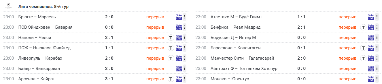 Результаты матчей после первого тайма на ваших экранах.