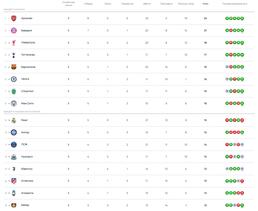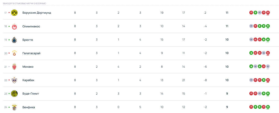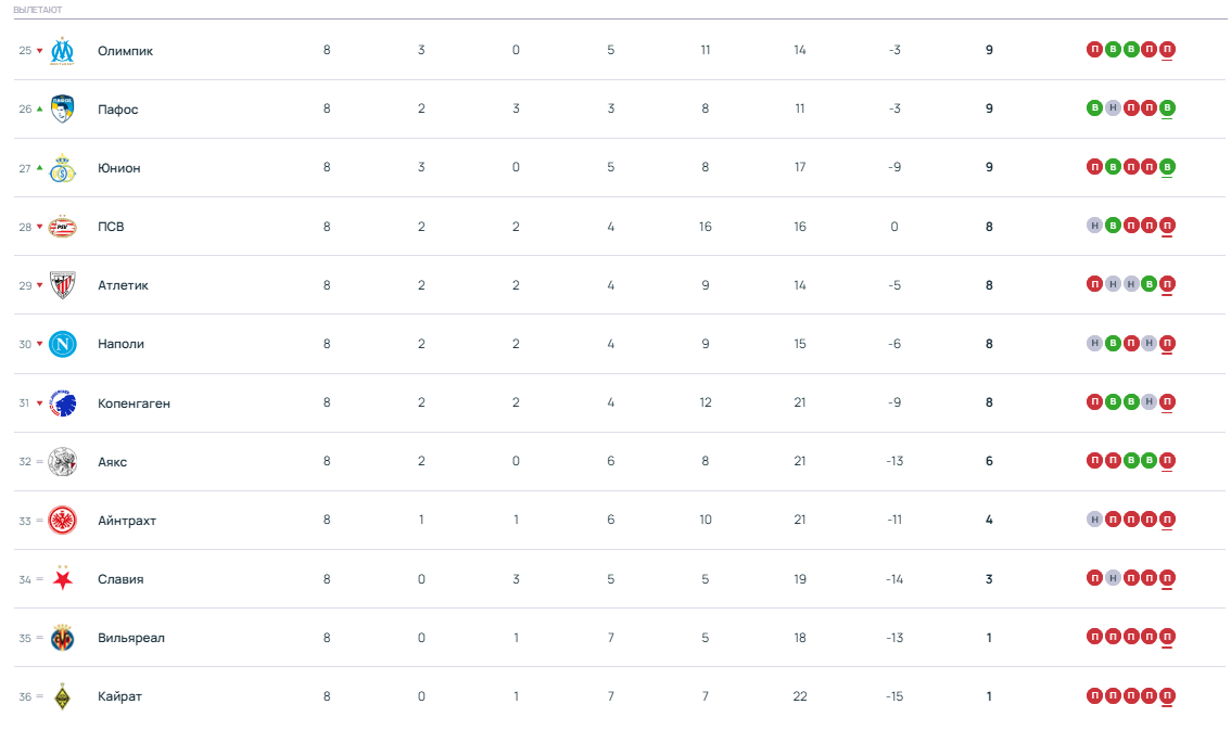 В режиме реального времени по девять очков у команд с 23-го по 27-е место: «ПСВ», «Марселя», «Атлетика», «Олимпиакоса» и «Пафоса». В случае равенства очков положение команд определит разница забитых и пропущенных мячей — у нидерландцев она +1, у французов -2, у басков -3, у греков и киприотов по -5.