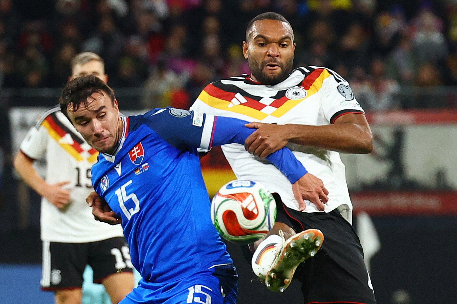 Защита Словакии справилась с подачей Сане в штрафную в атаке Германии.