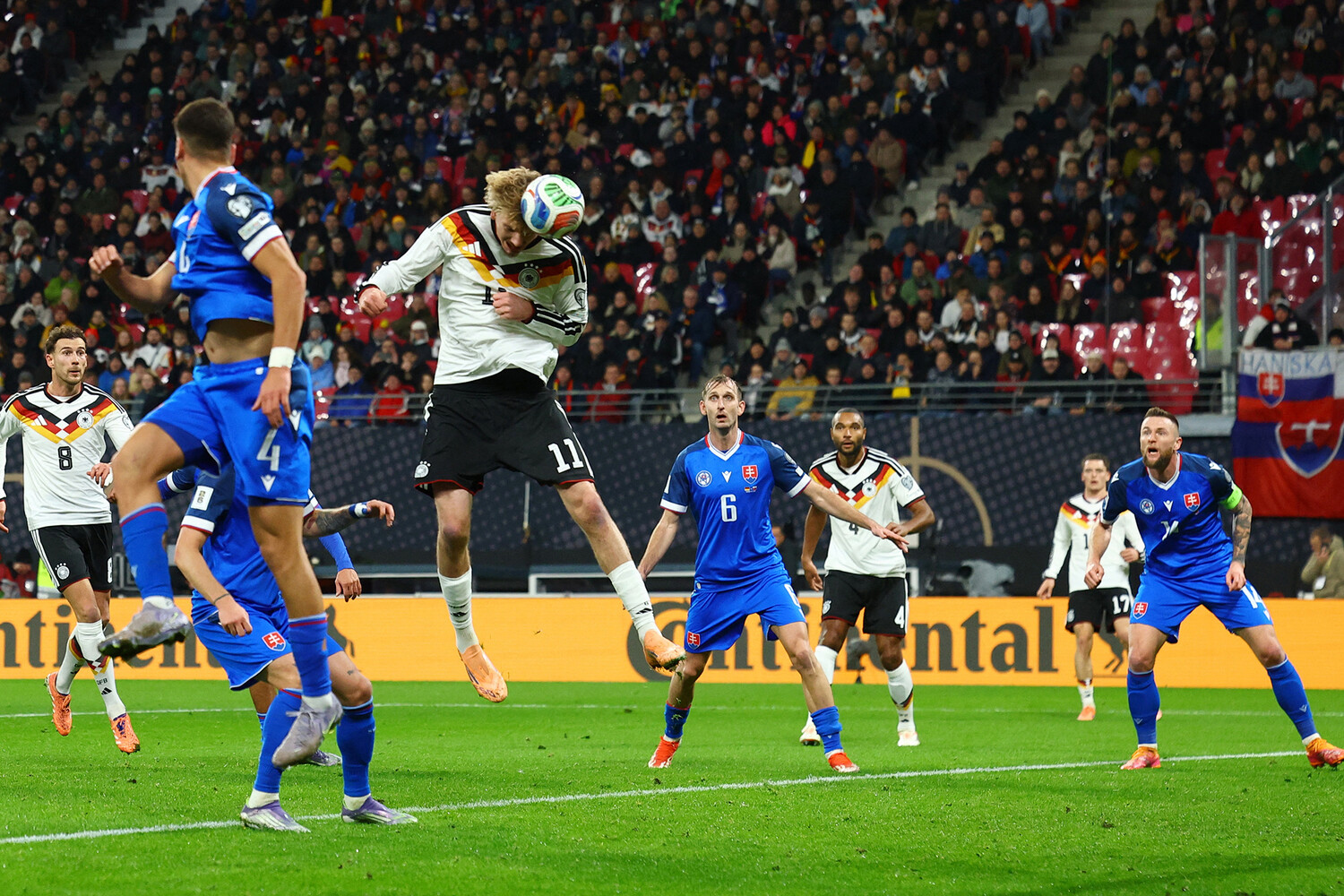 Вирц классно набросил в штрафную на дальний угол вратарской. Гнабри дотянулся до мяча головой, но тот взлетел вверх и опустился в руки голкиперу Словакии.