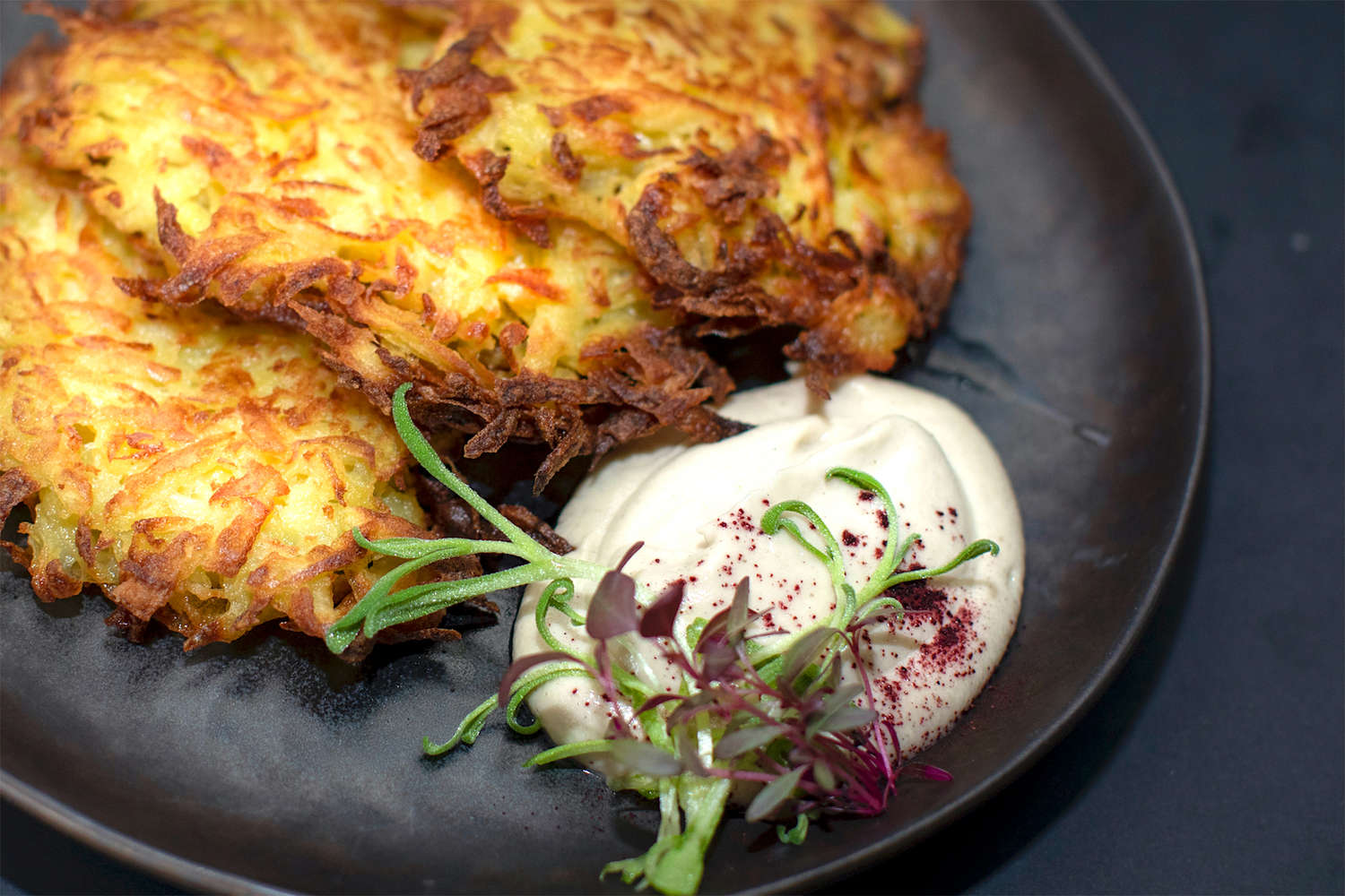 «В Пост драники можно подавать с домашней сальсой, аджикой или хренодером, мы подаем с «песто» из баклажанов. Баклажаны запекаем до мягкого состояния, обжигаем газовой горелкой (до появления аромата чернослива) и, очистив и отжав, пробиваем с добавлением растительного масла до состояния густого майонеза», — делится шеф
