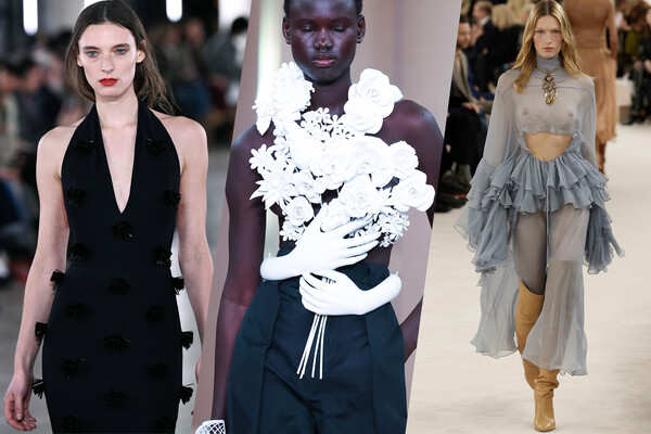 Цветочная карта в Париже была разыграна своеобразно и местами неожиданно. Дом Valentino ограничился объемными черными цветами в цвет платья, бренд Patou включил в коллекцию наряд, скромно расшитый цветочными кисточками, а вот креативный директор дома Balmain Оливье Рустен предложил носить цветы в виде топа-букета, оторванного, по всей видимости, прямо с руками (тема растительности у Balmain, впрочем, была больше раскрыта через виноградные лозы на платьях). Отдельные бренды — Chloe, Louis Vuitton, Giambattista Valli — украсили наряды таким количеством рюш и оборок, что они сами собой превратились в ходячие розы, эустомы и хризантемы с белыми, голубыми и белыми лепестками.