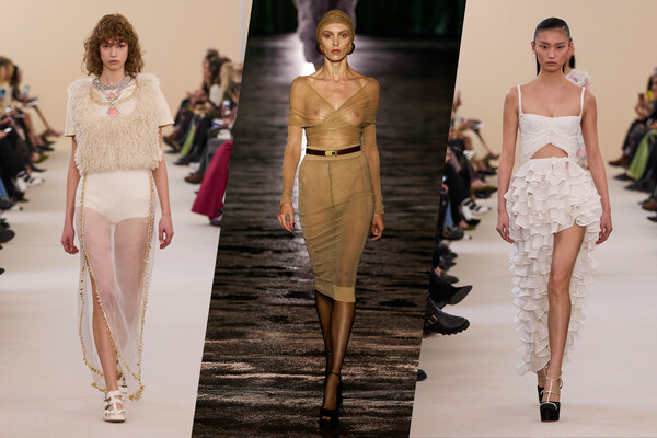Блузы, платья, топы, даже юбки из разнообразного шифона и кружева включили в коллекции почти все модные дома. Особенно выделился в этом смысле Saint Laurent, показавший практически прозрачную коллекцию, в которой некоторые платья и вовсе напоминали натянутые на все тело капроновые колготки, да еще и телесного цвета. Для дома это, впрочем, естественно, — именно его основатель Ив Сен-Лоран в 1966 году первым представил публике прозрачные блузки.