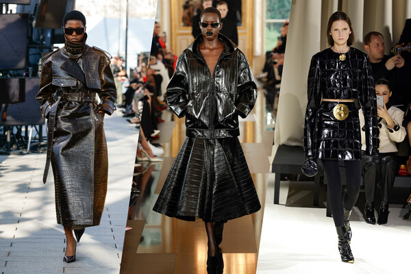 Кожи на подиумах в Париже, как и везде, было предостаточно — на осень и зиму нам предлагаются все варианты, от дубленок и кожаных плащей до платьев и топов, в основном — черных. Внимание на себя обращают многочисленные варианты тиснения, несколько оживляющие мотоциклетную эстетику. Дом Stella McСartney обошелся классической искусственной кожей «под крокодила», выделка кожи у Valentino напоминала шкуру рептилии уже весьма отдаленно, а лаковая кожа у Schiaparelli и вовсе выглядела стеганой курткой. Еще более причудливые варианты тиснения, в которых дело дошло даже до растительных узоров, предложили Comme des Garcons, Alexander McQueen, Nina Ricci и Balmain.
