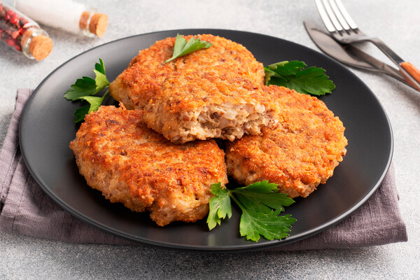 Приготовление. Смешайте ингредиенты для котлет, сформируйте котлеты и обжарьте на сковороде до готовности. Овощи для рагу нарежьте, обжарьте на оливковом масле, добавьте специи и тушите под крышкой 15 минут. Подавайте котлеты с овощным рагу.