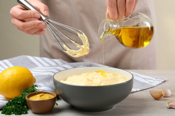 Масло — основной ингредиент майонеза, который определяет его консистенцию. Чаще всего используют рафинированное подсолнечное или оливковое масло из-за их нейтрального вкуса.