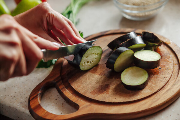 Обрезка. Отрежьте плодоножку и нижнюю часть баклажана, удалив поврежденные или жесткие участки. Это поможет улучшить текстуру готового продукта и убрать возможный горький привкус.