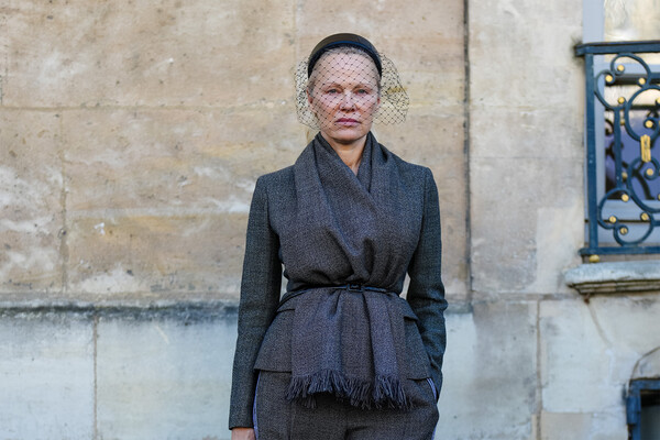 Она стала одной из тех редких знаменитостей, что на Неделе появились больше, чем на одном показе: Памелу Андерсон можно было увидеть на шоу Chanel и на показе Dior. И там и там она выступила в элегантном, но строгом виде и без макияжа. Для Chanel актриса выбрала комплект из свободной белой блузы с рюшами и глухим воротником — и плиссированные брюки-палаццо. На Dior Памелу Андерсон сфотографировали в суровом сером брючном костюме — подпоясанном тонким ремешком жакете с широким шарфом и широких брюках. Лицо ее прикрывала вуаль.