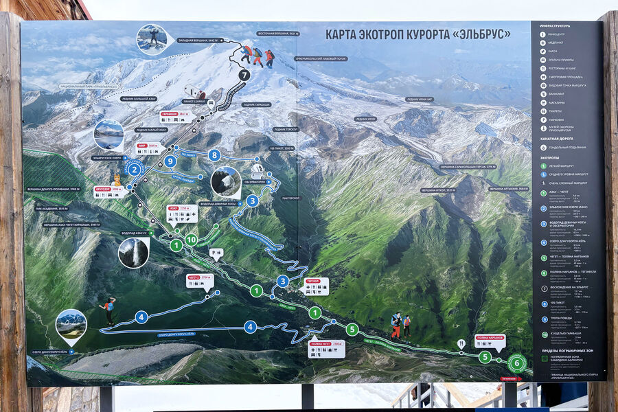 Зоны катания простираются от станции Азау (2350 м) до 3847 м над уровнем моря. Эльбрус располагает 17 километрами трасс, а с учетом новой зоны — почти 23 км.