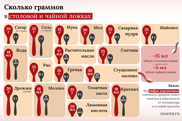 Еще один нюанс — «с горкой» или «без горки». Ложка, наполненная до краев, будет содержать меньше граммов, чем та же ложка с небольшой насыпанной сверху горкой. Именно поэтому в рецептах так часто уточняют способ измерения.