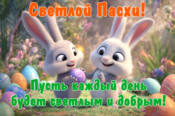 Милая открытка «С Пасхой!» и короткое поздравление — простой способ поднять настроение юному поколению вашей семьи, а также более взрослым родственникам, друзьям и знакомым. Скачайте картинку на смартфон или компьютер и отправьте в любом удобном мессенджере. А еще можно поделиться пасхальной открыткой в социальных сетях, чтобы как можно больше людей увидели ваш пост с поздравлением.