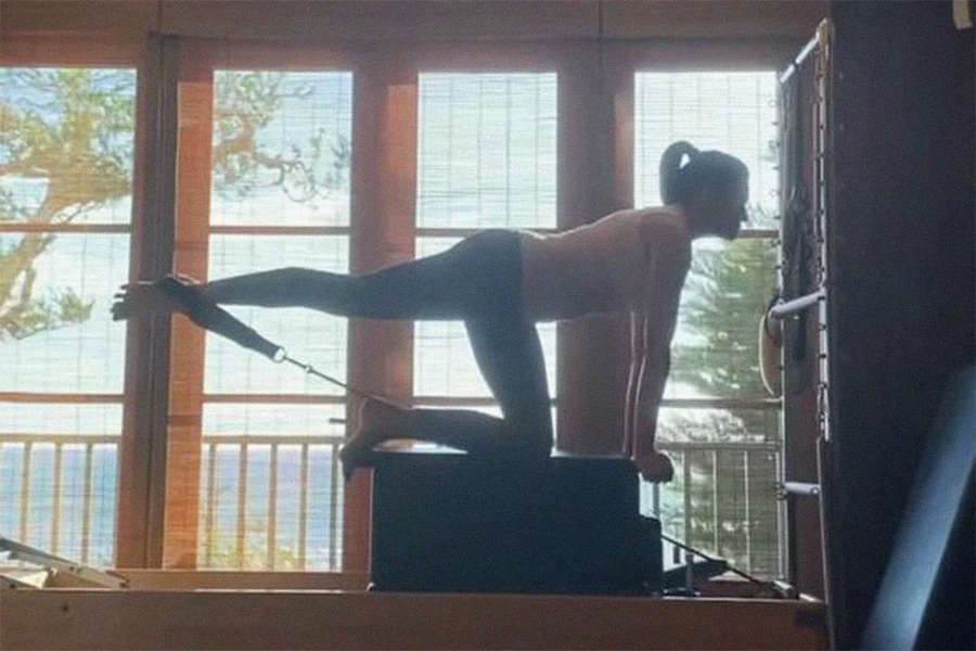Судя по всему, Кроуфорд занималась в домашнем спортивном зале. В кадр также попали высокие потолки и панорамные окна с видом на Тихий океан.