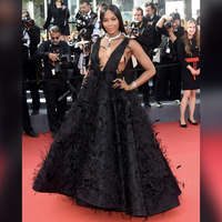 Наоми Кэмпбелл появилась на красной ковровой дорожке в черном кутюрном платье в пол итальянского модного Дома Valentino с глубоким декольте, украшенном перьями и молочными атласными лентами на плечах. Образ 52-летней супермодели дополнили колье и кольцо с сапфирами Bvlgari.