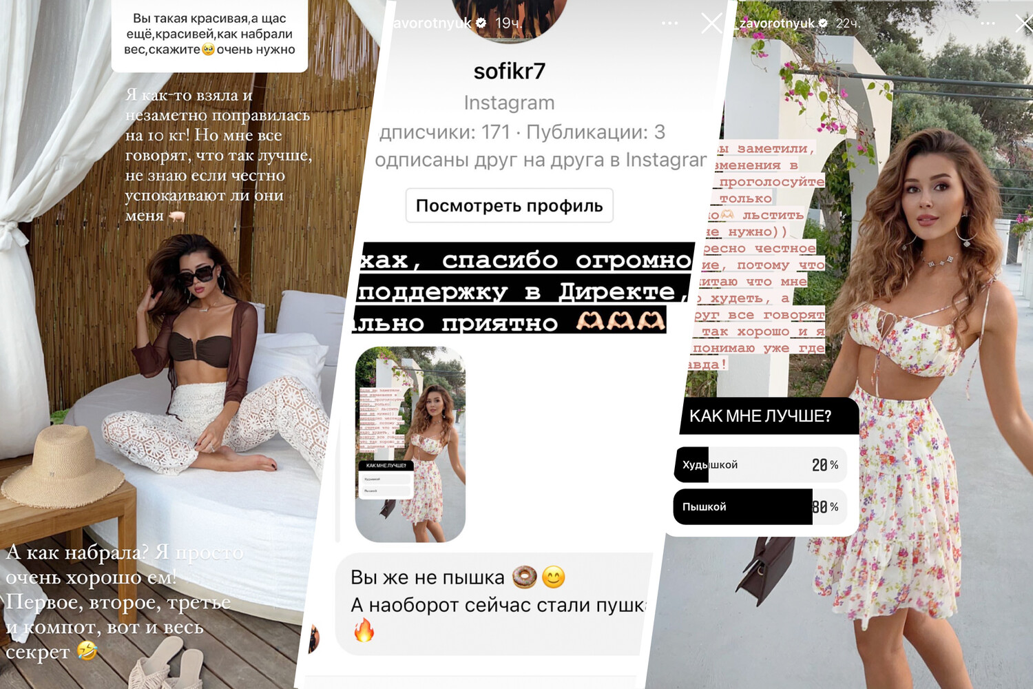 По словам Анны, она недовольна своей внешностью, а близкие твердят обратное. «Интересно честное мнение, потому что я считаю, что ме надо худеть, а вокруг все говорят, что так хорошо, и я не понимаю уже, где правда», — обратилась она к подписчикам. Большинство фолловеров девушки отметили, что ей лучше быть «пышкой», а один из них вовсе написал ей: «Вы же не пышка. А наоборот сейчас стали пушка».