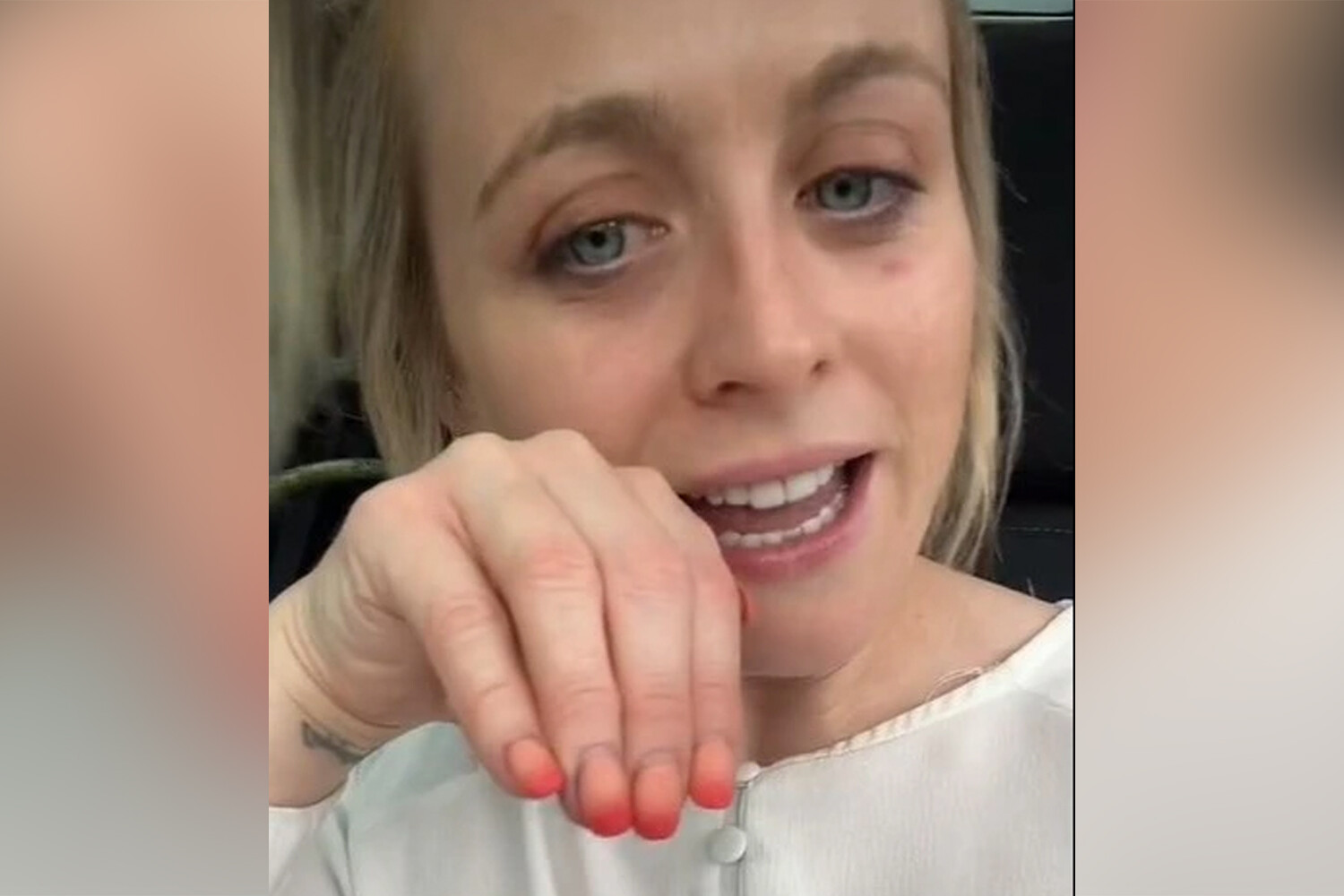 В TikTok Вудс опубликовала ролик, в котором показала неожиданный результат после посещения салона красоты. Вдохновившись картинками на Pinterest, блогер решила сделать маникюр с эффектом омбре – переходом из светло-бежевого оттенка в насыщенный красный. Однако мастер невнимательно отнеслась к процессу и добилась не того результата.