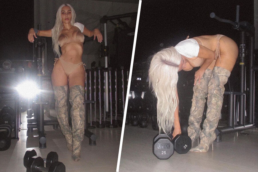 41-летняя Ким Кардашьян опубликовала серию фотографий, сделанных в спортивном зале. На снимках звезда реалити-шоу позировала посреди тренажеров в раздельном купальнике телесного цвета, состоящего из лифа с треугольными чашечками и плавок-бикини на завязках, и ботфортах на шпильке.
